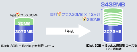 たとえば、IDisk 3GB + Backup無制限 コースを1年間継続した場合、 毎月ストレージ領域に30MBのポイントディスク容量×12ヶ月=360MB